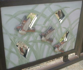 | 公園橋の欄干に貼りつけてある白地の陶板に陶製の小鳥 |
