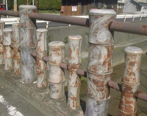 | 東橋の欄干に志野釉を掛けて焼かれた陶器が飾られています。 |