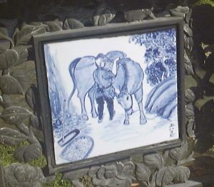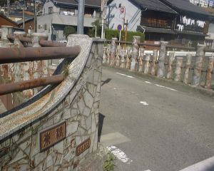 | 宮前橋の欄干の表裏に瀬戸染付焼きの陶板が貼られ、各陶板に 陶土の採掘から陶磁器完成までの各工程が描かれている。 欄干裏の陶板はほとんど見えないので、貼りつける場所が問題。 |