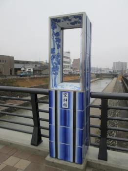 | 2014年2月1日、瀬戸市の窯神橋(南北の長さ22.5m、橋の幅41.8m) の四隅に伝統工芸の瀬戸染付焼で制作された親柱(高さ2m; 上半分は空洞でLED照明が施されている))が一本ずつ設置された。 瀬戸染付焼工業協同組合の伝統工芸士21人が制作。 |