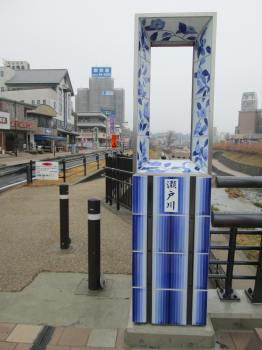 | 窯神橋の歩道の西側の瀬戸染付焼の作品群 (2月2日まで展示) |