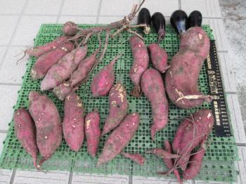 | 10月7日収穫したサツマイモと秋ナス <植えたサツマイモ苗の3〜4本分でこれだけとれた; 右端は30cmスケール> |