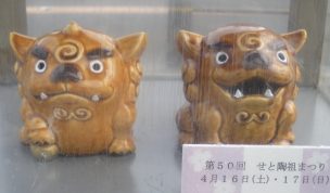 | 「第50回せと陶祖まつり」が2011年4月16日(土)17日(日)催されます。 これに合わせ、ショーケース内の作品が陶器又は磁器製の狛犬(こまいぬ) に入れ替えられました。 |
