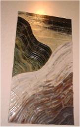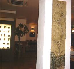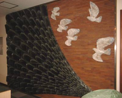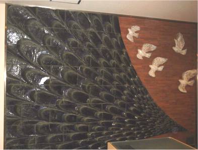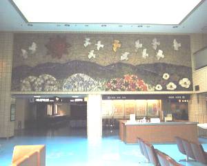 | 公立陶生病院の待合室 東の陶壁 「瀬戸の四季」加藤舜陶氏作 <拡大図は「ヤフーフォト」参照> Waiting room in public hospital, Tousei Byouin Pottery wall at east "Four seasons of Seto" made by Mr. Sunto Kato [See "Yahoo photo" for enlargement ] |