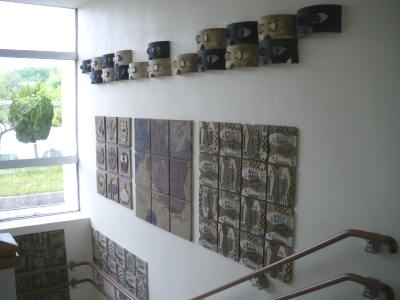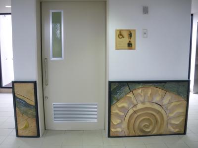 | 陶壁「火と土」 玄関東側(写真左) 玄関西側(写真右) <瀬戸陶芸協会・瀬戸青年会議所制作> |