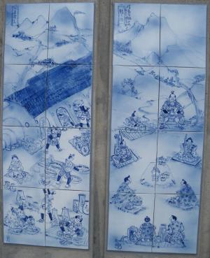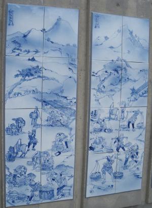 | 品野陶磁器センターの北端に飾られている昔の瀬戸の陶器の製造工程 (土掘りから窯だし)を示す染付磁器 |