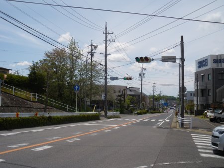 | 県道57号の交差点「新郷町東」付近から南西方向を望む 梶田神社は県道57号の交差点「新郷町東」(写真手前の信号)と その約200m先(写真奥)の交差点「幡野町北」の中間位に位置している。 「新郷町東」付近にはスーパーマーケット「フィール」、「幡野町北」付近には ドラッグストア「スギヤマ」があり、そこでの買い物を兼ね、撮影。 |