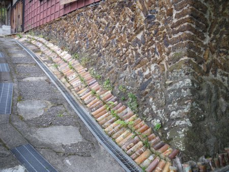 | 窯垣の小路沿いの民家の鬼板の土留 説明陶板に「景観重要建造物第2号 鬼板の土留 平成24年10月11日 瀬戸市」と表記 |