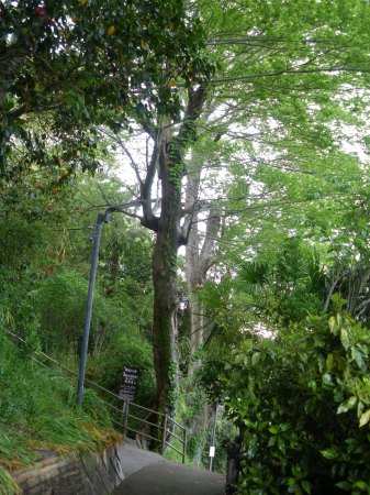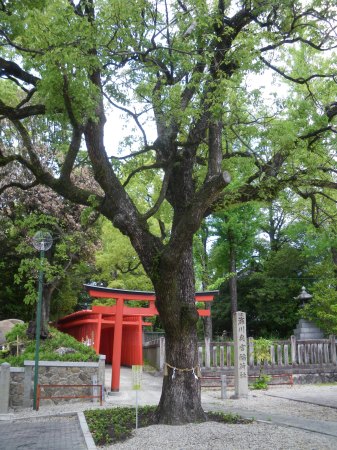 | クスノキ(深川神社境内) <説明の出所:説明板>風を受けると聞こえる音は、クスノキの葉がふれあってささやくはなし声のようです。 伊勢湾台風(1959)に耐え百年以上も生きてきた弓なりの木姿。雄々しい幹に触って撫でてください。この木 のパワーが伝わってくる気持ちになります |