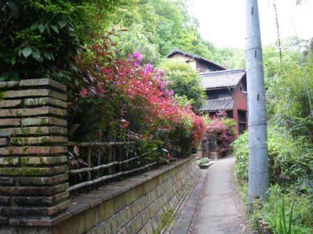 | 窯垣の小路と案内板 案内板は「窯垣の小路、窯垣の小路ギャラリー、洞街道」とムクノキを説明している ムクノキ椋の木-ニレ科 <出所:案内板の説明> 花5月 実10月 山野にはえる落葉高木。材は折れにくく、また割れにくいため、陶磁器製品を運ぶための天秤棒 として利用される。 洞ではあちらこちらに見られるムクノキはその昔、天秤棒として利用するため に植えられたものといわれている。このムクノキをたずねて歩くと、その付近に必ずといってよいほど 古窯があったとされる。また、今なお窯を操業しているところもあり、ムクノキを線で結ぶことによって、 今昔にわたる洞の窯場密集地域を知ることができるとも考えられる |