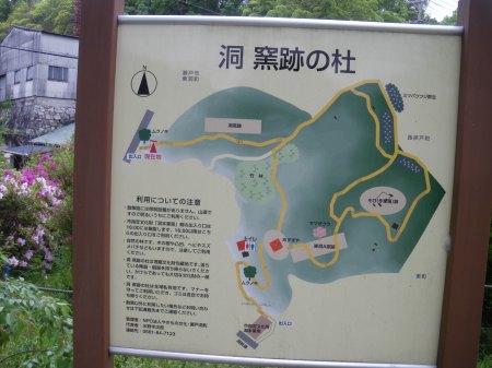 | 洞窯跡の杜の案内板 洞窯跡(ほらかまあと)<説明の出所:説明板> 現在地から一段上の斜面上には、連房式登窯が構築されていた。平成24年7月に行われた 調査では、窯の胴木間(どうぎま)と呼ばれる燃焼室から煙道部分にあたるコクドまでが確認され、 窯体の規模は全長約25m、幅約7mとなることが明らかにされた(ロープで囲まれた部分が 窯跡の推定範囲)。部分的な調査であったため、製品を置いて焼くための部屋(一の間、二の間など) の数は明らかではないが、推定で12房となると思われる。こうした規模は、瀬戸では江戸時代以降、 陶器生産に使われた「本業窯」と呼ばれる連房式登窯に一般的にみられるものである。 江戸時代以降、瀬戸で使用された連房式登窯はこの他にも「丸窯」や「古窯(こがま)」と呼ばれる窯炉 が知られている。丸窯は江戸時代後期以降、大型の磁器製品の生産に使用され、各部屋の幅や奥行、 高さは本業窯のそれと比べて大きいものの、その数は5・6房となる。一方古窯は明治時代以降みられ、 小型の磁器製品を焼成した。各房の幅や奥行が狭く房数も3〜4房と少ないのが一般的である。 調査において窯内から出土した遺物は、ほとんど江戸時代末期の染付椀や皿といった磁器製品で あったが、窯体の規模から推定すると本窯跡では、江戸時代末期の磁器生産が、本業窯で行われた 可能性が示されたといえる。また、確認された窯体の下には別の窯体が埋まっていることが明らかに なった。これは、同じ場所で窯の改修が何度も行われたことを物語っており、近世から近代の瀬戸窯業隆盛 の一翼を担った洞町を象徴しているといえる。 |