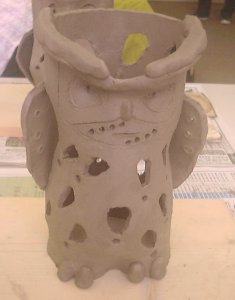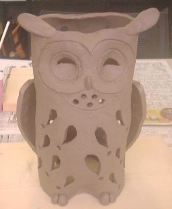 | かみさんが成形した陶製ふくろう | ウェブ作者の陶製ふくろう <目の上部に切込みを入れてない が、焼成されアカリを灯されたら どうなるか不安と楽しみ半々> |
