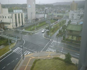 | 教室から北東を見下ろした風景 <手前に記念橋、交差点右角に緑の織部瓦の旧せと案内処「らくちん」、 右奥に宮前歩道橋が見えます> |