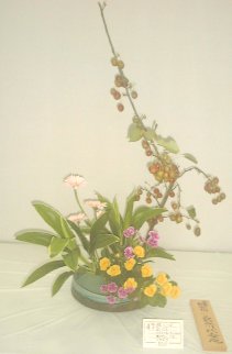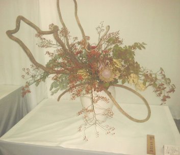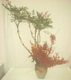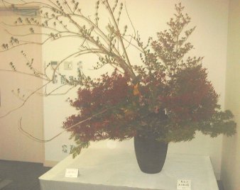 | 生け花 <構成する木や花:赤づる、秋色アジサイ、オンシジューム、赤百合、紫式部、 ワックスフラワー、レンファレ、トルコキキョウ、深山リンドウ、都忘れ、ユーカリ> |