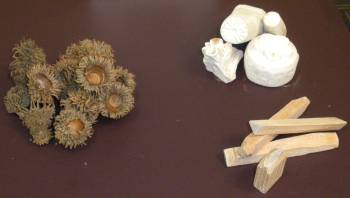 | ドングリの笠 <説明板→アベマキ(ブナ科)の笠から作った液で、織部のくすみを 取ったり、渋入れに使います。> 印花(いんか) <説明板→木や石膏など手作りの印花で、模様を描きます。> |