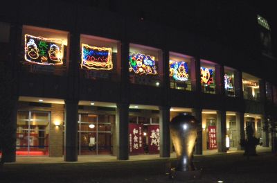 | 「瀬戸蔵」前から「パルティせと」を見る」 <「あかりアート作品コンテスト」の作品が窯神橋まで展示されている> |
