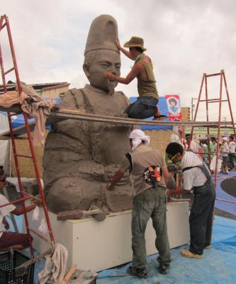 | 巨大藤四郎像公開制作 <彫刻家亀谷政代司氏が瀬戸の粘土1トン以上を使い、高さ2.5mの 藤四郎像を制作;左の図を基に右の写真の小さい像を作り、高さ2.5mの巨大像を制作; <「青の広場」にて> |
