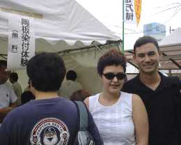 | 2002年9月14日のせともの祭の雰囲気を写真でイメージして下さい。 Please see an atmosphere at the 71st Setomono Festiva onOn September 14, 2002,. 昨年はやや天気がぐずついたにもかかわらず、2日間で約53万人がせともの祭に 来られたので、今年は客足がもっと伸びるかもしれません。 (9月15日新聞発表では初日28万人) Although, last year, the weather remained unsettled, about 530thousands peple visted this festival in two days. So, this year, the weather is fine and more people is expected to visit this festival. (280 thousands visitors on the first day, Sep.14, 2002. according to local newspaper, Chuunichi Newspaper) せともの祭のお客さんは、当然ながら瀬戸の神社等の観光見学よりも買い物優先 という方が多いようでした。 小生が午前中に案内した若いご夫婦(ご主人はパーシーさん)のコースを歩いた順に 紹介します。(説明の番号と写真の番号は一致しています。) The visitors to Setomono Festival naturally would like to shop ceramics rather than sight-seeing of shrine, etc. I introduce the course in order of walk which I took in the morning with young married couple (Mr. Percy and his wife) . (The numbers for the following explanation correspond with the ones for photos.) 1 名鉄尾張瀬戸駅前の陶板染付体験コーナーにて陶板染付を体験 (写真は染付体験終了後、ブースの前で撮ったもの) 素焼きの陶板(biscuit pottery plate)に鉛筆で概略スケッチを書いた後に、墨の 絵の具(paint)のような呉須(zaffer)に絵筆(painting brush)を漬け、その絵筆を 使って概略スケッチの上をなぞる。今回、は”花”、”葉”、”昆虫”の中から任意 のイメージを描くということでした。この陶板は釉薬を付けて焼かれた後、2005年 愛知国際万博の会場迄の沿道に永久に設置されます。 *瀬戸染付の絵付は画布に見たてられた素地に呉須の濃淡で水墨画のような、 繊細で緻密な絵を描くものです。 1 Experiences with underglaze on pottery plate at the experience corner in front of Owari Seto station of private railway, Meitetsu Seto Line (The photo was taken after finishing the experience.) The manner is as follows: After drawing rough sketch with pencil on a biscuit pottery plate, dip a painting brush in zaffer (or paint) and outline with thin tip brush, and then paint with a thicker brush. The theme for underglaze this time is "flower", "leaf" or "insect". So, we drew each outline in accordance with each image corresponding the theme . The drawn biscuit pottery plate will be glazed and fired., and placed for ever along the road from Seto to the site of International Exhibition of Aichi 2005 * Blue underglaze is called Seto-Sometsuke. This is to draw delicate and precise picture with shade of zaffer like a drawing in India ink on canvas-like biscuit ware . 2 窯神神社 手水舎(写真参照)にて心身を清め境内に入った。 境内には次の銅像等があります。 @加藤民吉: 瀬戸の陶磁器の磁祖 A加藤唐左衛門: 加藤民吉が九州有田で学んだ技法に基づき製造した陶磁器 を江戸初め全国への販売ルートに乗せた江戸時代の尾張藩内の政商 B津金文左衛門胤臣: 公私にわたり民吉が陶器の研究に精を出せるように援助 してくれた熱田奉行 瀬戸市の繁栄が今日あるのは加藤民吉に負うところ大です。この民吉に感謝し、 今後も瀬戸が繁栄することを祈る産業祭がせともの祭です。 神社の境内から北側に瀬戸のグランドキャニオン(陶土採掘場)が見えます。 2 Kamagami Shrine At the hand washing house (See the photo) in Kamagami Shrine, we washed hands and entered into the precinct. @ Mr. Tamikichi Kato: Founder of Seto porcelain A Mr. Tozaemon Kato: Businessman with political contacts in the domain of Owari (Aichi Pref. at present) in Edo era (1642 - 1868). He marketed and expanded the sale of porcelain products manufactured by technology Tamikichi learned in Kyushu (or northern island of Japan). B Mr. Bunzaemon Tsugane: The magistrate in Atsuta district (Nagoya at present) supporting Tamikichi and his father officially and privately in order for them to be able to study ceramics. Prosperity of Seto city is mainly owing to Tamikichi. Setomono Festival is held in honor of Tamikichi Kato and the biggest festival in terms of industrial festival in Japan. Grand Canyon of Seto (pottery clay and silica sand mining field) are viewed from this precinct towards north. 3 無風庵 藤井達吉は愛知県が生んだ偉大な芸術家で愛知県碧海郡棚尾村(現碧南市)に 生まれました。 彼が小原村で開いていた塾が無風庵で塾生に多くの瀬戸の陶芸家 がいたので小原村ではなく、瀬戸にその庵が移築されることになった。 3 Mufuuan (building with thatched roof) Mr. Tatsukichi Fujii is one of great artists in Aichi. He run a cramming school called 'Mufuuan' in Obara village where many ceramic artists from Seto gathered. Therefore, Mufuuan has been dismantled and reconstructed in Seto. 4 法雲寺 陶製梵鐘(第2次大戦中金属回収令で梵鐘を供出させられ、代用品として昭和17年 (1942年)制作された。現存するのは全国でこれだけと思われる。 4 Houunji Temple Bell of Buddhist temple was delivered due to metal collecting law during the Second World War. So, the substitute was made of ceramics in 1942. 5 中学校の露店 瀬戸市民会館駐車場に瀬戸市内の中学校の内2校が出店 5 Stalls of junior highschool students Stalls of 2 junior highschools among Seto City junior highschools are exhibiting their handmade pottery works in the parking lot of Seto Citizen Hall. 6 瀬戸市民会