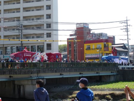 | 万博おばさんがトーチリレーを持ち目的地へ到着しつつある(写真奥が吉田橋) |