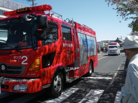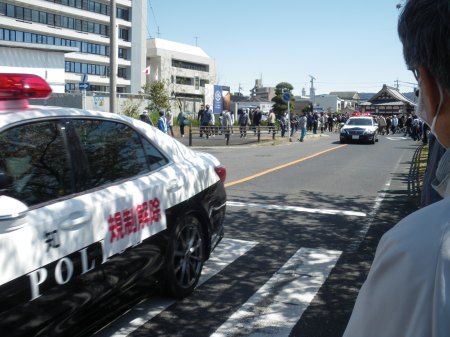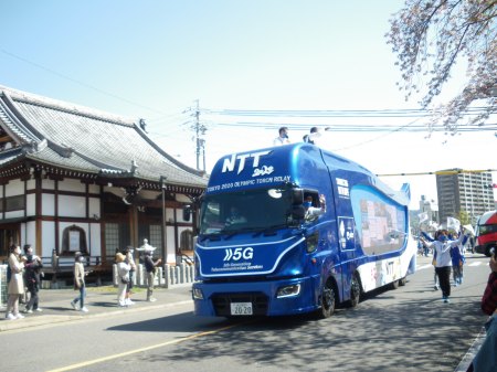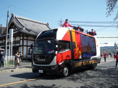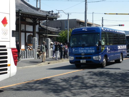 | ”おふどうさん”の前を通るTOYOTAの車 (フロントガラスの上の車体枠にTOKYO 2020 OLYMPIC TORCH RELAYと書いてある) |