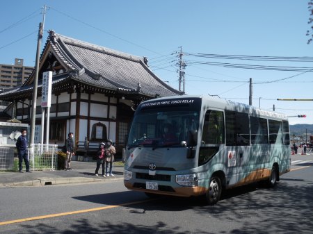 | 車体前と横にTOKYO 2020 OLYMPIC TORCH RELAYと書いてあるマイクロバス |