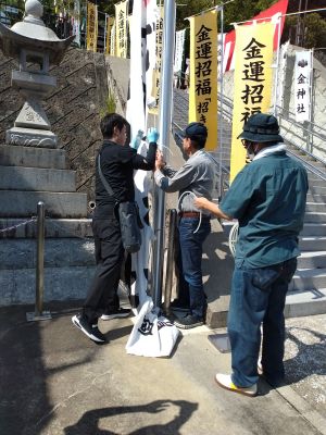 | 白色の大きい幟を取付中 | 白色の大きい幟の取付完了 |