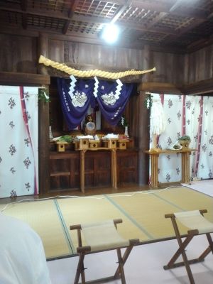 神事の場所 (奉賛会が拝殿で神事を終え てから、参拝客が茅の輪くぐりをし、 拝殿にお詣りする) |