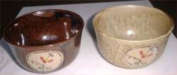 | 店内の陶壁<女性は店員さんです>(左)と頂いたどんぶり(右) Pottery wall inside the resutaurant (left hand side) bowls given free (right hand side) |