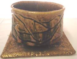 松山氏の織部茶碗 <写真からはわかりにくいですが、 通常の織部とは風合いが違います> Tea bowl with Oribe glaze produced by Mr. Matsuyama <Color and glaze tone is much more tasteful than those in tea bowl with usual Oribe glaze; Color and glaze tone shown in this photo is not same as those of actual one> |