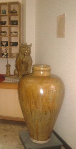 | 稲山陶苑のギャラリー内 <左:高さ約1.2mの灰釉の壷> <右:展示販売品の一部> Inside gallery of "Inayama Touen" <Left: Ash-glazed pot with 1.2 m in height> <Right: Part of pottery work exhibited for sale > |