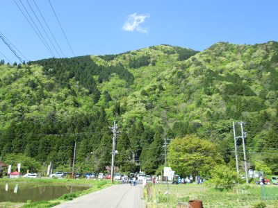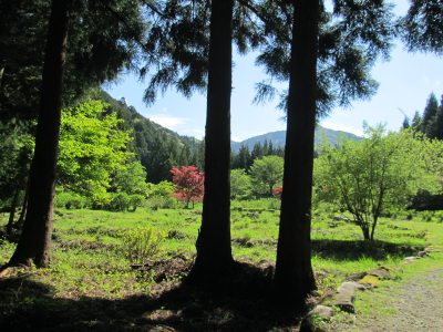 | モネの池」から「あじさい園」駐車場へ戻る時の新緑の山の風景 |