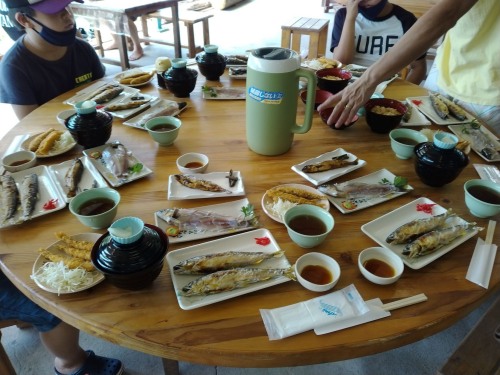 | A定食 (鮎の塩焼き2尾、鮎フライ3尾、鮎の刺身1尾、鮎の甘露煮1尾、鮎のご飯) |