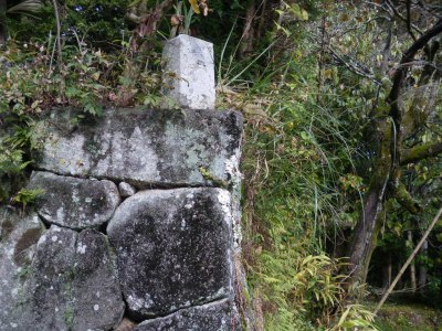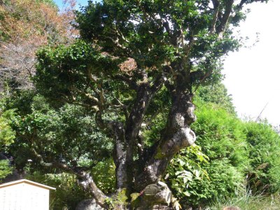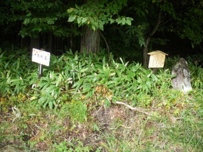 | 梅屋の「さざんか」と道祖神(大草) (細野から曾木に入ったこの地に梅屋と呼ぶ質屋があった。「さざんか」(樹齢250年ともいわれ ている)が当時の面影を残している。また、石垣の角に小さな道祖神が造立されている) |
