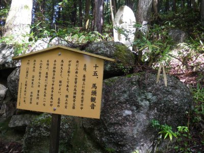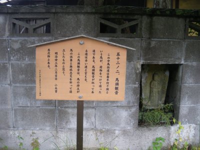 | 五十二ノ二 馬頭観音 (この中馬街道は毎年何千頭という馬が、 荷物をつけて通った道である。馬頭観音が 祀ってある道は古い道と言える。 この馬頭観音は、馬の持ち主が馬の供養と 無病息災を祈って造立したものと思う。 明治丗三年二月吉日 小木曽房次郎 とある) |