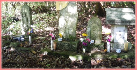 石仏(中洞) (左:氏神、右:馬頭観音、昔、この曲がり道で 事故が多発し、近所の7軒で造立したもので、 毎年5月5日を供養日とし、現在では5日に近い 日曜日に供養している。造立後事故は無い) |