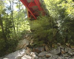 恋路の吊り橋から北を見る (奥に見える赤い橋の接写は右) Viewing north at the bridge (Close-up of red bridge visible to the back is shown at right hand side photo |